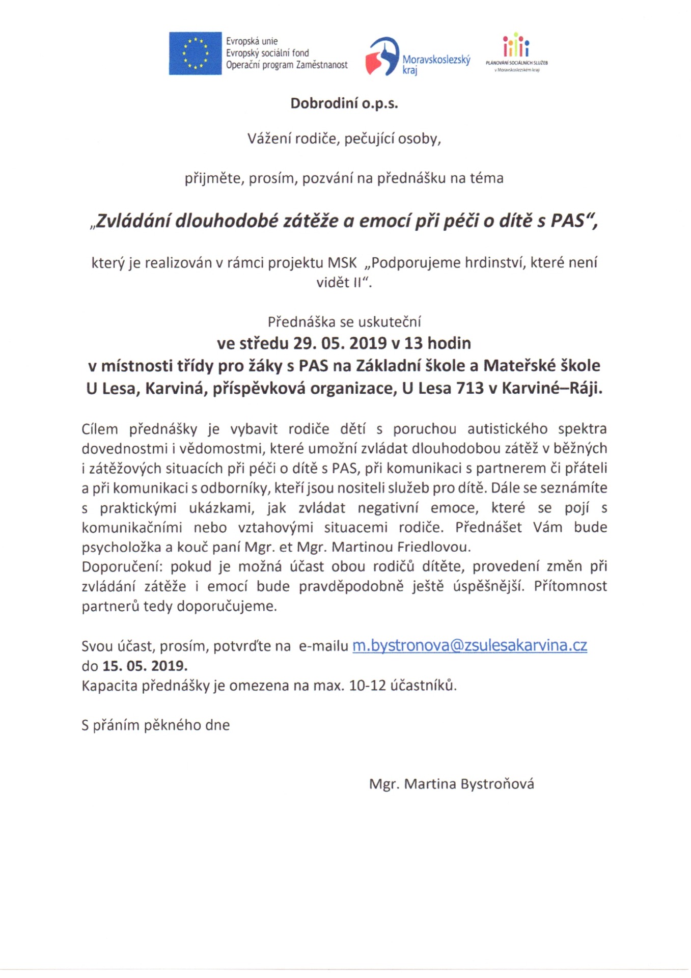 Pozvánka pro rodiče pečující o dítě s PAS na workshop "Zvládání dlouhodobé zátěže a emocí při péči o dítě s PAS"