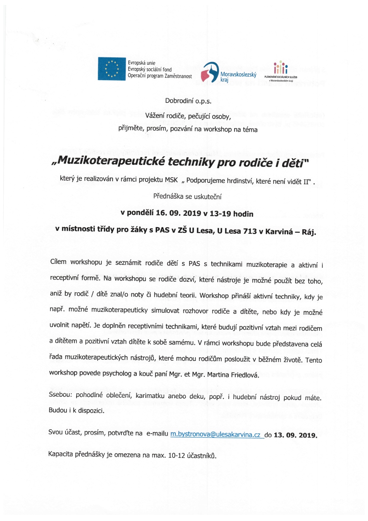 Pozvánka na "Muzikoterapeutické techniky pro rodiče i děti". Datum konání 16. 9. 2019 od 13.00 do 19.00 hodin.