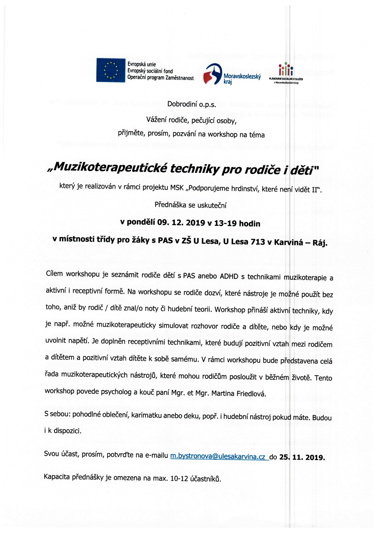 Díky o.p.s. Dobrodiní pedagogové vytvořili Svépomocnou skupinu pro podporu rodin žáků s poruchou autistického spektra. Tato skupina se zapojila do dvou projektů MSK "Podporujeme hrdinství, které není vidět". Díky této podpoře třídní pedagog organizuje aktivity jako například: