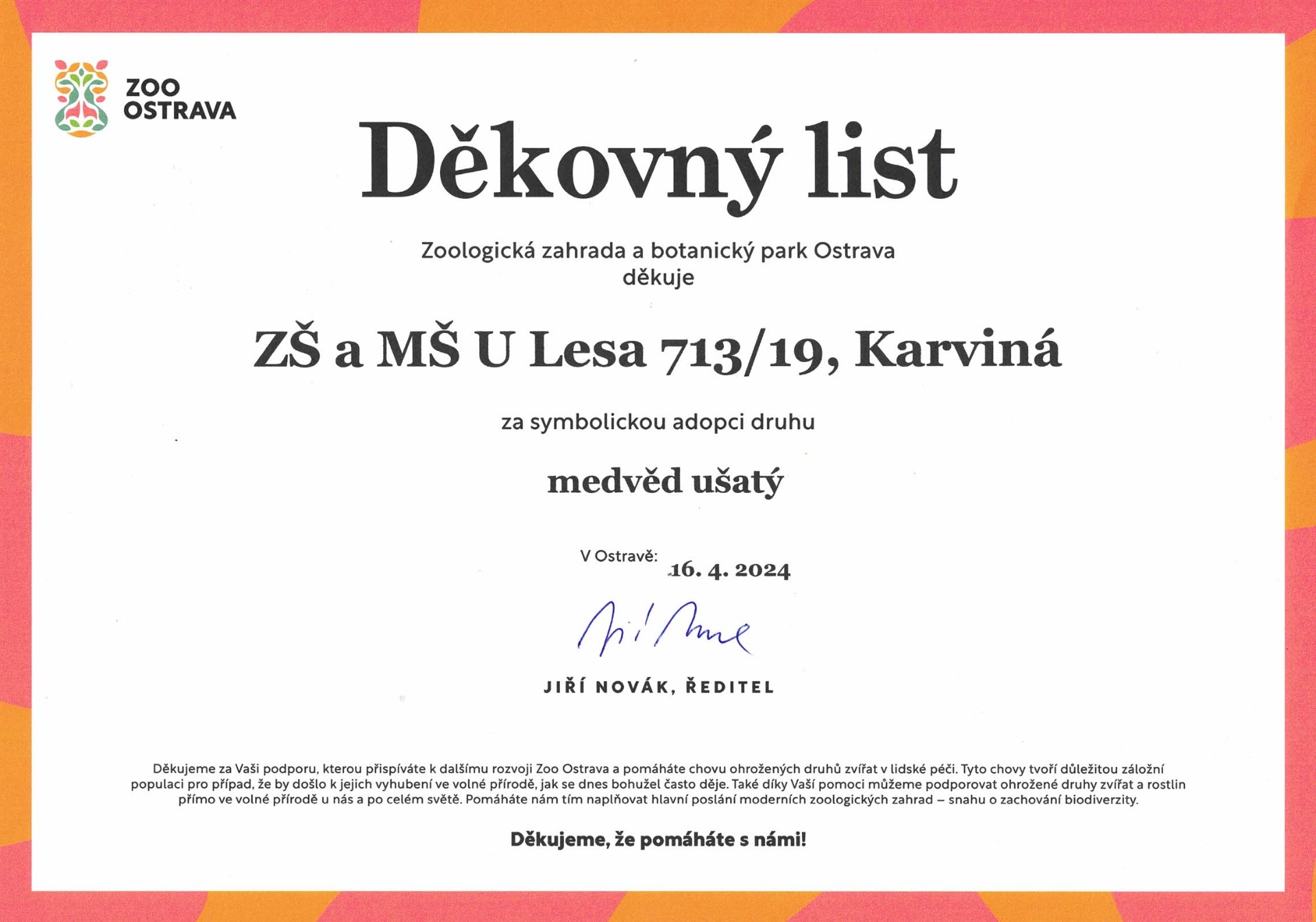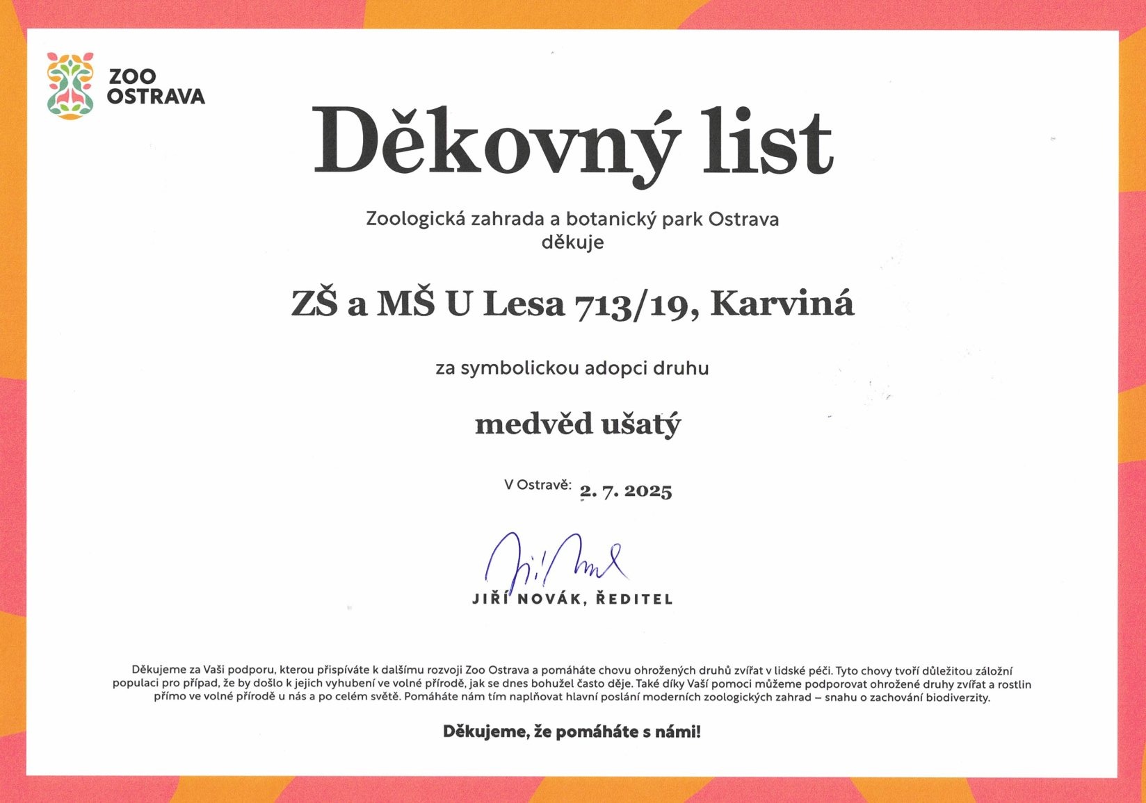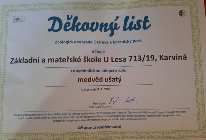 Za finanční podpory Dobrodiní o.p.s. dne 13. 6. žáci ZŠ a MŠ U Lesa navštívili medvěda ušatého a jeho zvířecí kamarády v ZOO Ostrava. Návštěva se vydařila. Viděli jsme spoustu zvířat, získali mnoho zajímavých informací, využili atrakcí v ZOO. Počasí nám přálo, sluníčko svítilo a nám se to líbilo.