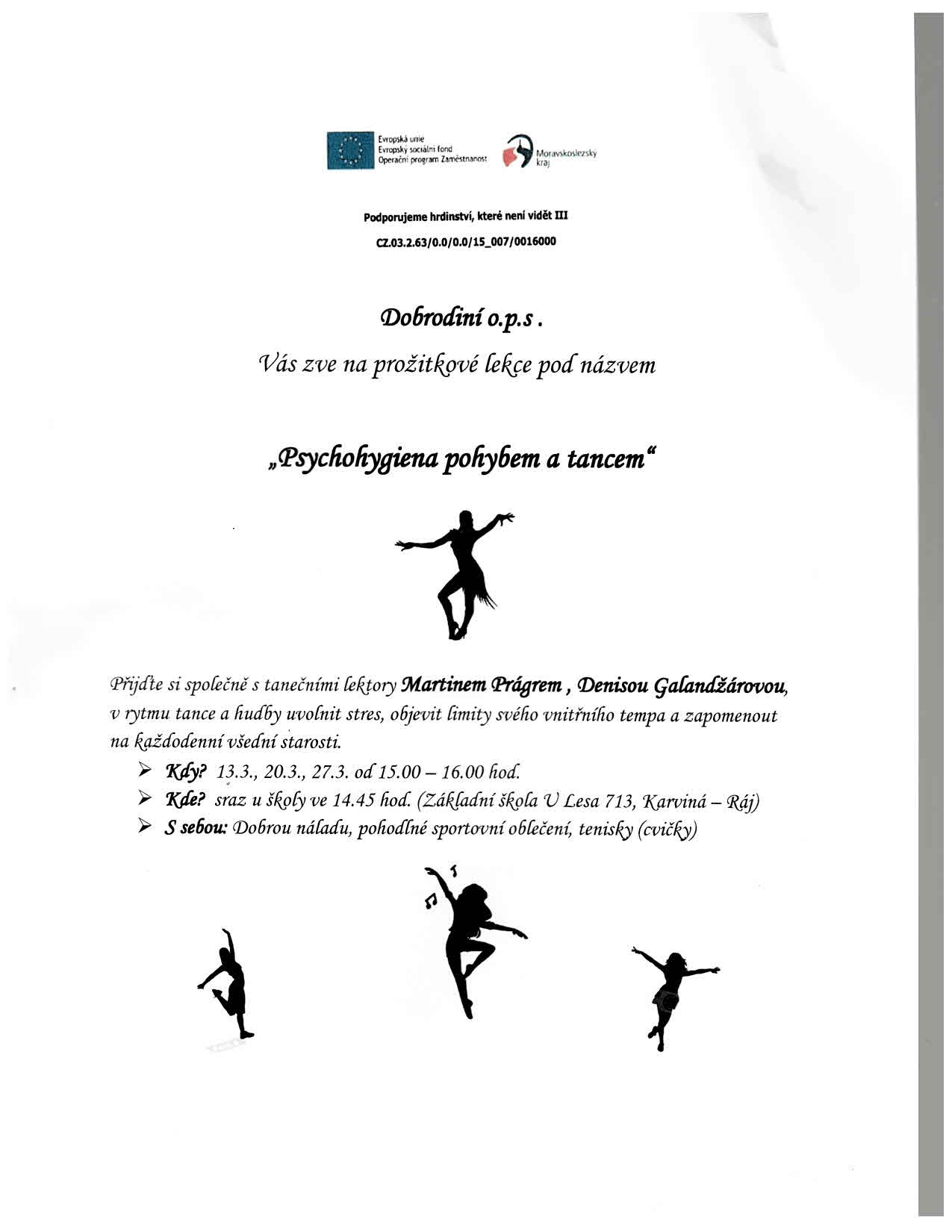 V rámci psychohygieny pečujících se díky projektu mohli uskutečnit prožitkové tanečně-pohybové lekce s profesionálním tanečníkem Martinem Prágrem a Denisou Galandžárovou pod názvem "Psychohygiena pohybem a tancem". Pečující si během tance odreagovali nejen od všedních starostí, ale tanec významně ovlivnil jejich psychiku. Naučili se správnému dýchání, které je důležité při zklidnění ve při stresových situacích. Formou prožitkových lekcí se snažili koncentrovat se na všechny části svého těla, povzbudit nebo uklidnit svou mysl. Hudba a tanec jim pomohl vyplavit ze sebe stres, starosti nebo smutek, vybít přebytek energie, nebo naopak dobít unavený organismus. Lekce na pobytech byly zakončeny tanečním večerem celé rodiny, takže se do tance zapojily i jejich ratolesti.