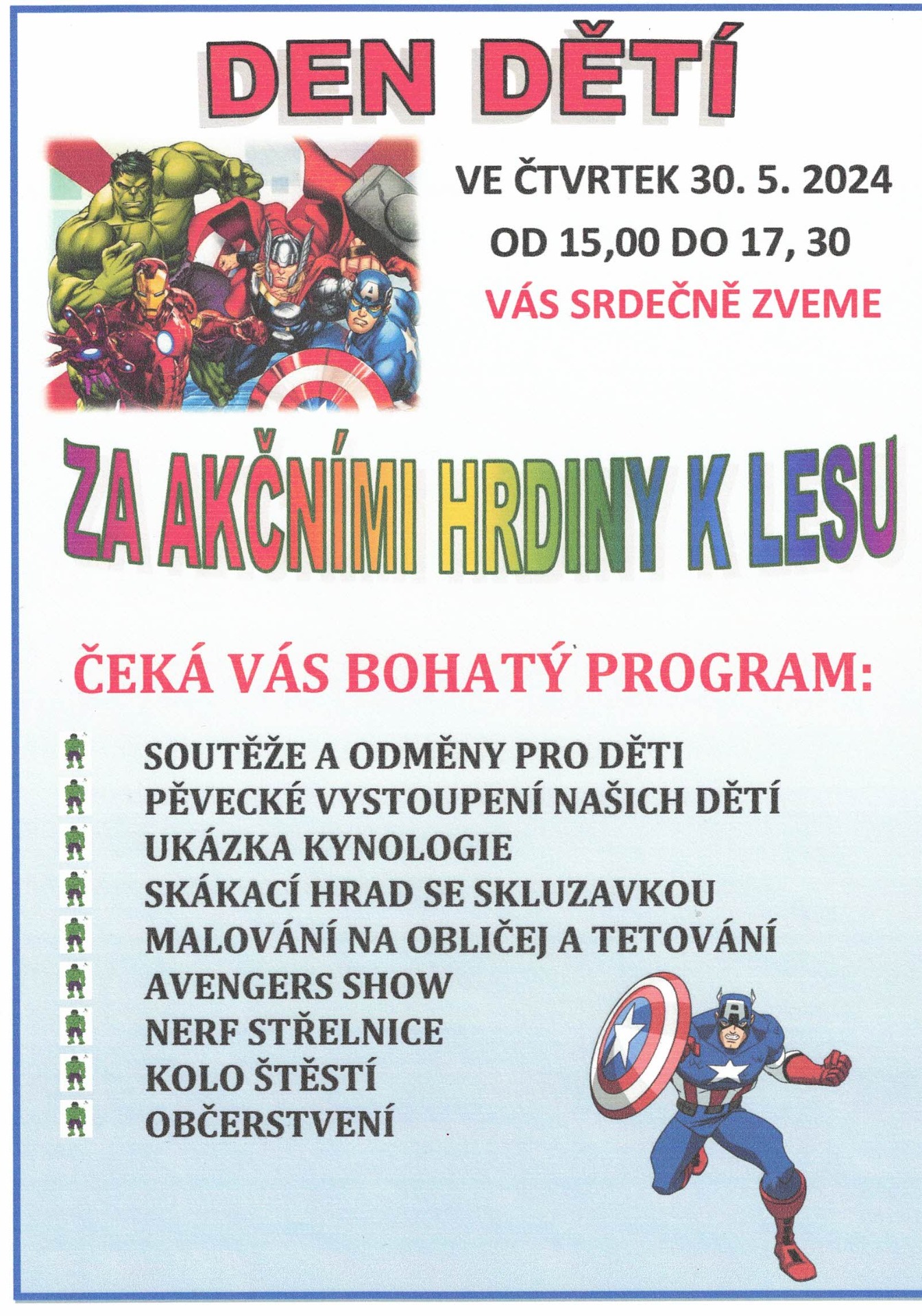 Zveme všechny naše příznivce na Den dětí, který se bude konat ve čtvrtek 30. 5. 2024 od 15.00 hodin na hřišti Základní školy U Lesa.