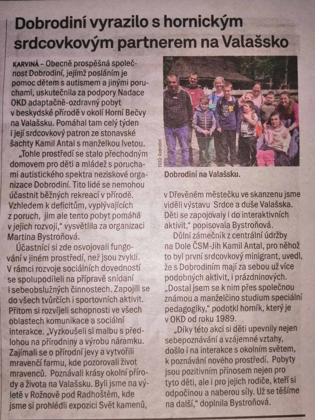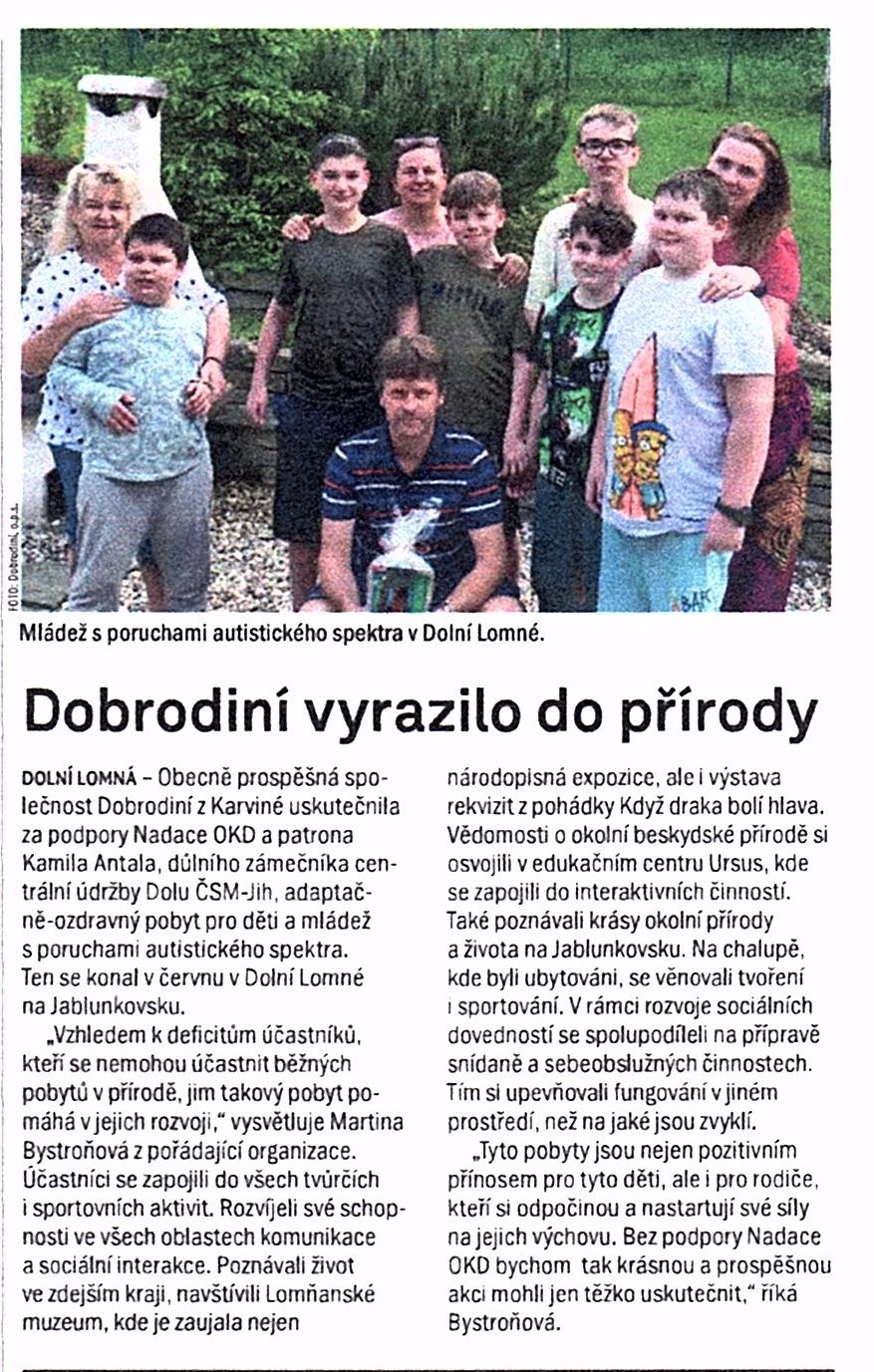 Za podpory Nadace OKD a patrona Kamila Antala uskutečnilo v červnu Dobrodiní o.p.s. Adaptačně ozdravný pobyt pro děti a mládež s poruchami autistického spektra. Tento pobyt se konal na chalupě v Dolní Lomné na Jablunkovsku. Tyto osoby se nemohou účastnit běžných pobytů v přírodě. Vzhledem k deficitům, vyplývajících z poruch, jim tento pobyt pomáhá v jejich rozvoji. Účastníci se zapojili do všech tvůrčích i sportovních aktivit. Rozvíjeli si své schopnosti ve všech oblastech komunikace a sociální interakce. Poznávali život ve zdejším kraji, navštívili Lomňanské muzeum, kde je zaujala nejen národopisná expozice , ale i výstava rekvizit z pohádky "Když draka bolí hlava". Vědomosti o okolní beskydské přírodě si osvojili v edukačním centru Ursus, kde se zapojili do interaktivních činností. Dále poznávali krásy okolní přírody a života na Jablunkovsku. Na chalupě se zapojily do tvořivých i sportovních činností. V rámci rozvoje sociálních dovedností se spolupodílely na přípravě snídaně a sebeobslužných činností. Tímto si upevňovali fungování v jiném prostředí než jsou zvyklí. Tyto pobyty jsou nejen pozitivním přínosem pro tyto děti, ale i pro rodiče, kteří si odpočinou a nastartují své síly na jejich výchovu. Už se těšíme na další pobyt.